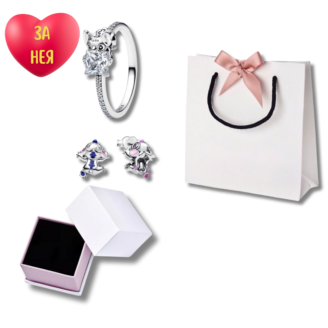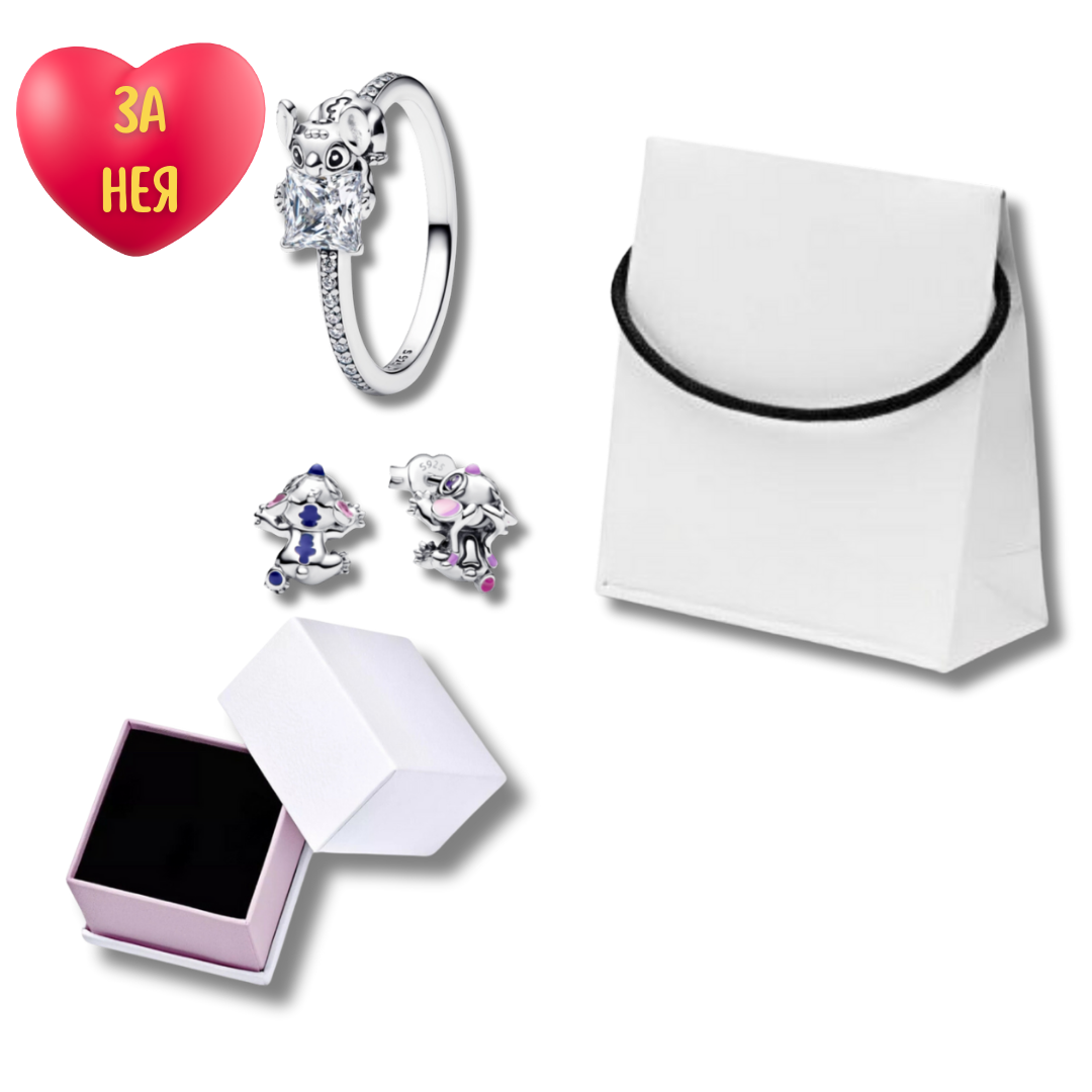 💙 Очарователен сребърен сет „Стич“, включващ сребърен пръстен и обеци Стич, в комплект с подаръчна кутия и стилна торбичка. Перфектният подарък за фенове на Дисни и сладките детайли.